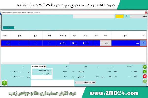مثال: میخواهیم بطور مثال مقدار 500 گرم آبشده 750 را از مشتری آقای در صندوق2 ور تاریخ 20/01/1402 و مدرک دریافت کنیم