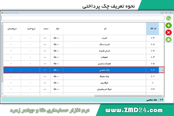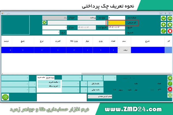 نحوه تعریف پرداخت چک در نرم افزار حسابداری طلا زمرد :