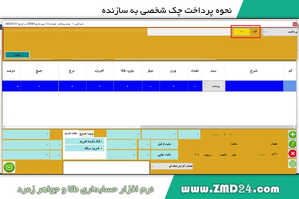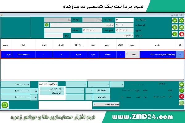 نحوه پرداخت چک شخصی به سازنده در برنامه حسابداری طلا زمرد :