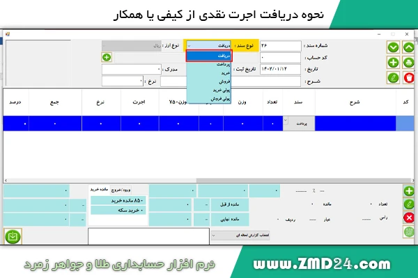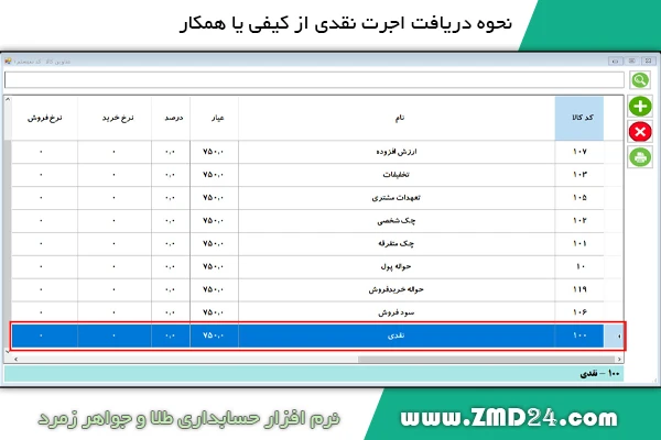 نحوه دریافت اجرت نقدی از کیفی یا همکار در برنامه حسابداری طلا زمرد: