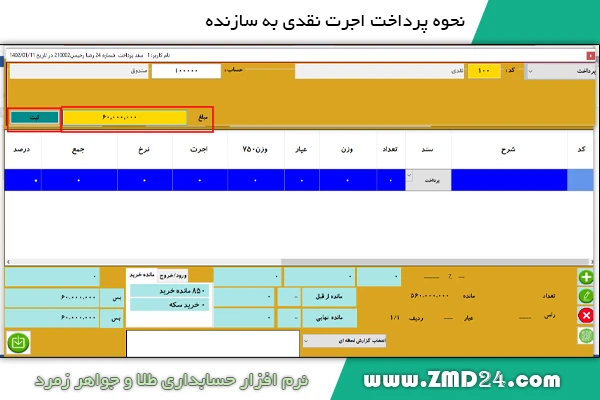 نحوه پرداخت اجرت نقدی به سازنده در برنامه حسابداری طلا زمرد:
