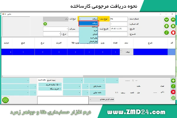 نحوه دریافت مرجوعی کار ساخته از کیفی / بنکدار دربرنامه حسابداری طلا زمرد: