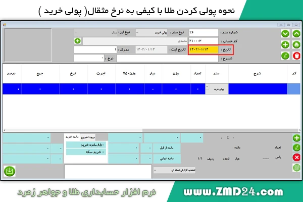 نحوه پولی کردن طلا با کیفی یا همکار به نرخ مثقالی(پولی خرید) در نرم افزار حسابداری طلا زمرد