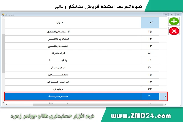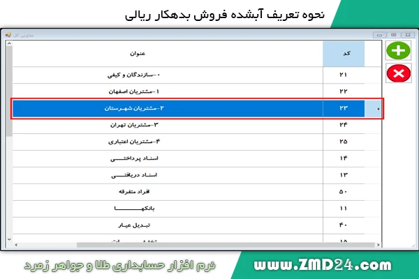 نحوه تعریف یک آبشده فروش بدهکارریالی در برنامه حسابداری طلا زمرد: