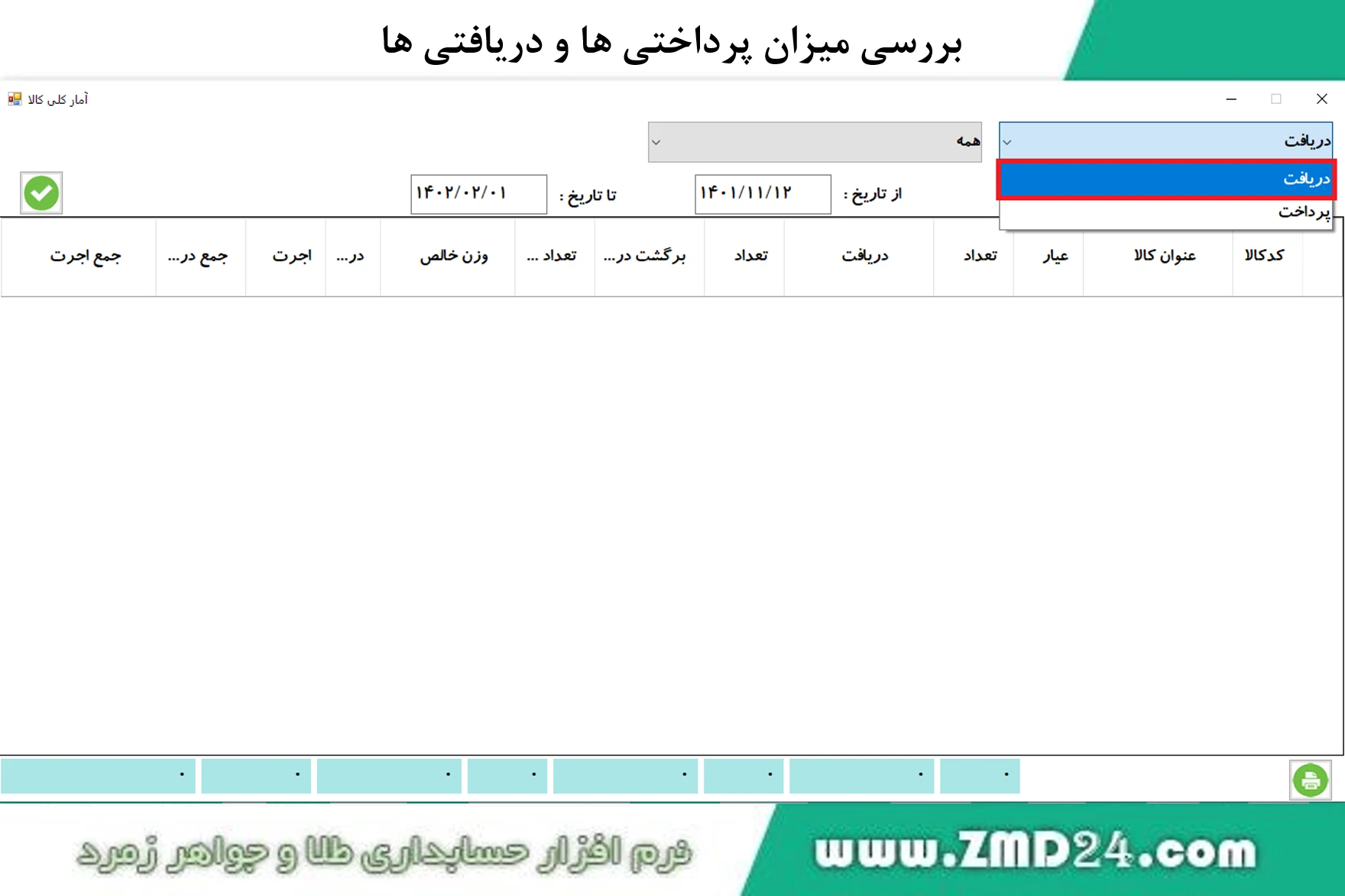 بررسی میزان پرداختی ها و دریافتی ها در برنامه حسابداری طلا زمرد :